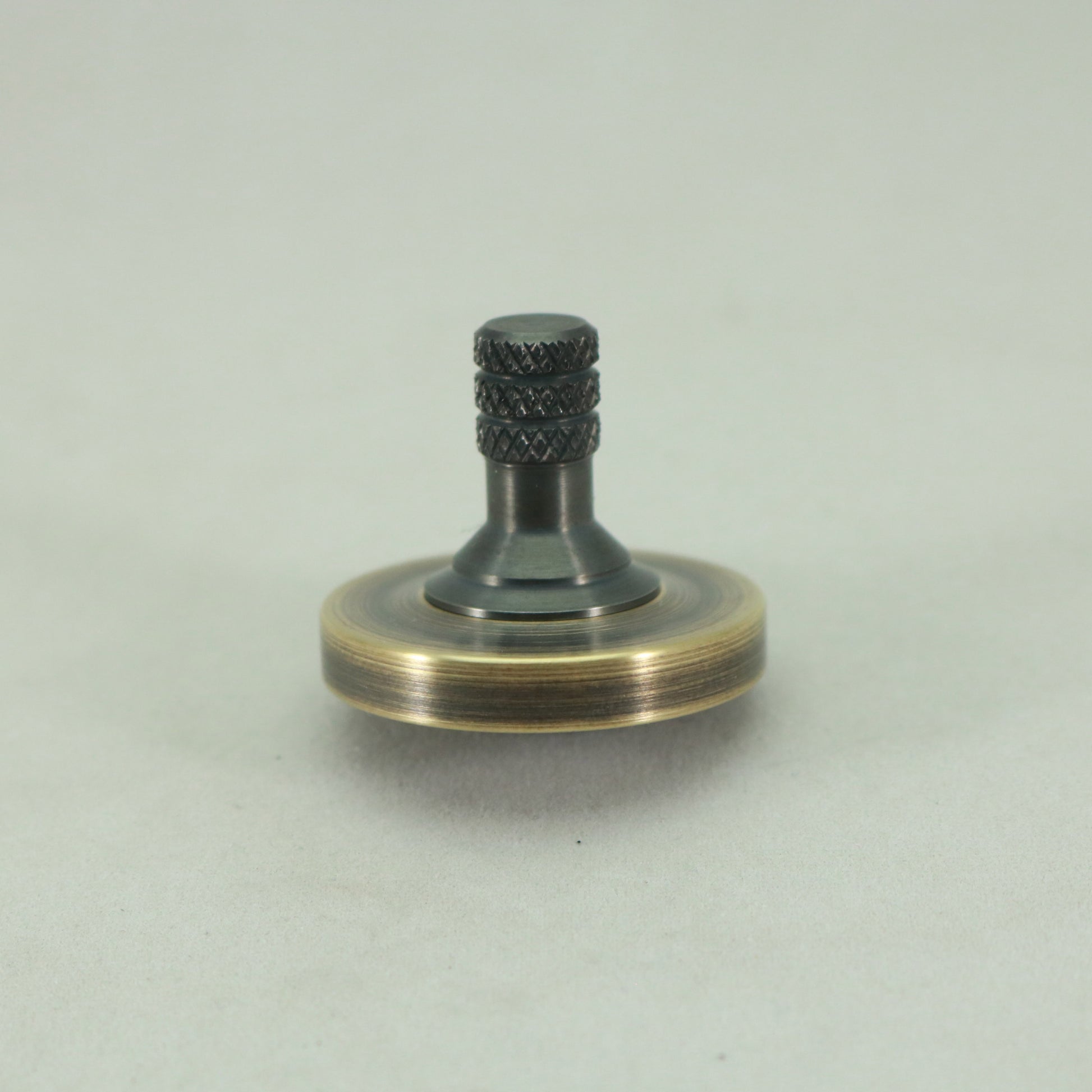 The Kemner Design Two-Step is a precision made metal spinning top. This top features a bi-level taper design from it base to its stem which sports three distinct knurled rings. The spin surface is a precision Si3N4 bearing. The two-step was crafted on a CNC lathe, followed by hand finishing and knurling of the stem on a manual lathe. The weight is crafted from solid brass and features an antique finish, while the stem is crafted in solid stainless steel and sports a gun metal finish.